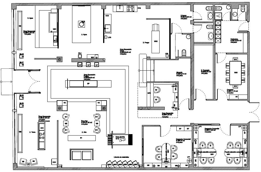 Empleamos ingentes cantidades de piedra natural y artificial en muy diferentes acabados y despieces en planta baja. En la zona técnica introducimos la madera y el acero, enmarcando las piedras en librerías y mesas técnicas.